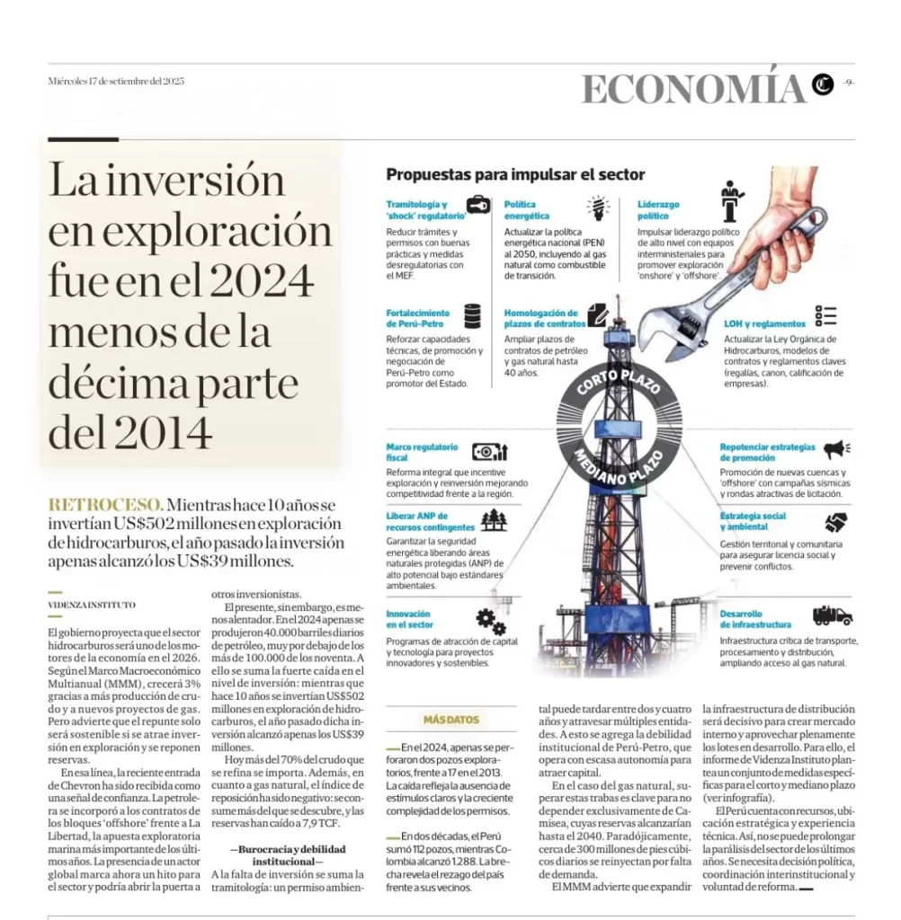 En un nuevo estudio de Videnza Instituto planteamos una hoja de ruta con medidas para dinamizar el sector de hidrocarburos (con énfasis en el gas natural), asegurar su competitividad y promover una transición energética equilibrada. El gas es el energético de la transición. El informe establece que la caída sostenida en la inversión exploratoria se debe a un marco regulatorio desfasado, poca predictibilidad contractual, sobrecarga de trámites, etc. Proponemos mejoras normativas (ley general de hidrocarburos), incentivos para la exploración y reinversión, el fortalecimiento de Perupetro, estrategias para mejorar la licencia social y la gestión ambiental, entre otros.