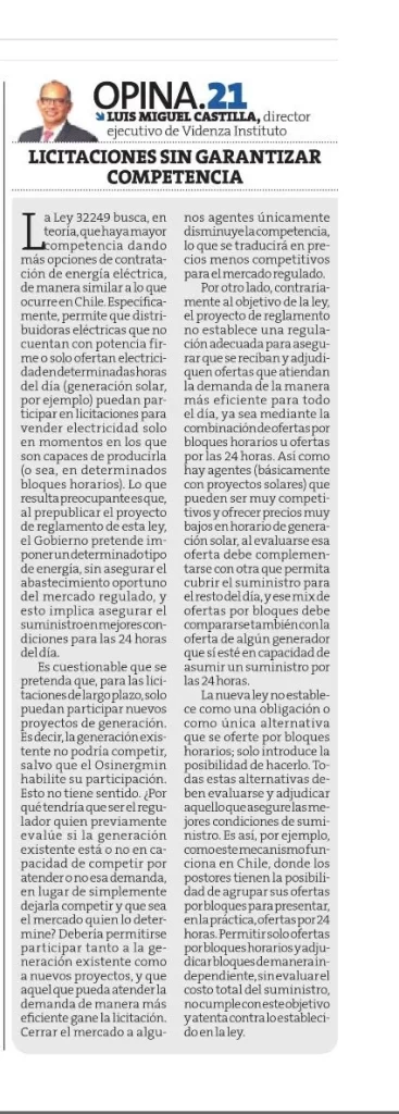 Entre los principales temas observados de este proyecto, podemos mencionar que se pretende que para las licitaciones de largo plazo (aquellas que tienen un plazo entre 5 y 15 años) solo puedan participar proyectos de generación, es decir, que no pueda competir por el suministro para el mercado regulado la generación existente, salvo que el OSINERGMIN, luego de una evaluación administrativa, considere que la generación existente puede competir, entonces habilitaría su participación. Esto no tiene sentido. ¿Por qué tendría que ser OSINERGMIN el que previamente evalúe si la generación existente está o no en capacidad de competir por atender esa demanda, en lugar de simplemente dejarla competir y que sea el mercado quien lo determine? Debería permitirse participar tanto a la generación existente como a nuevos proyectos y que se adjudique a aquel que pueda atender la demanda de manera más eficiente. Segmentar y cerrar el mercado a algunos agentes únicamente disminuye la competencia y eso se traducirá en precios menos competitivos para el mercado regulado.